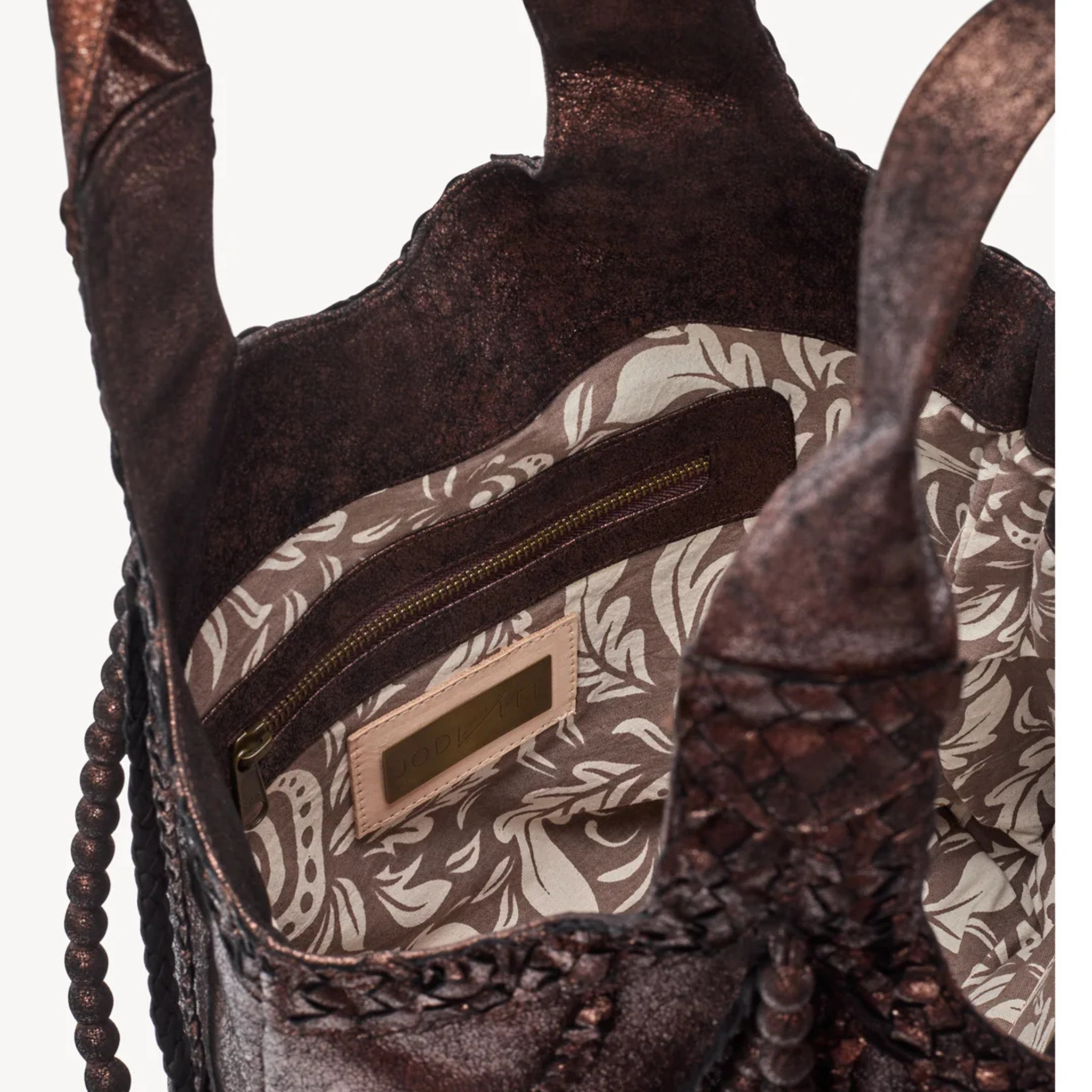 The Kelsey Tote Bag Bronze combines artisanal craftsmanship with luxurious design. Crafted from metallic bronze Napa leather, it features elegant woven plait details and a distinctive leather-covered bead embellishment. Designed for comfortable shoulder carry with two flat leather handles, it secures easily with a magnetic clasp. Inside, a spacious interior lined with 100% cotton printed Jodi Lee fabric offers a zippered pocket and two open compartments for organized storage. Measuring 30cm high, 39.5cm wide, and 14cm deep, it comes with a protective dust bag to maintain its refined allure.